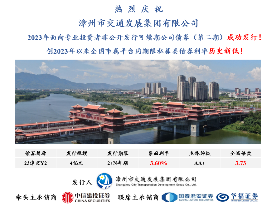 此次成功發(fā)行,離不開(kāi)牽頭主承銷商中信建投證券以及聯(lián)席主承銷商華福證券和國(guó)泰君安證券的全力支持和配合,是集團(tuán)與承銷商、投資者多方共同努力的結(jié)果,不僅為集團(tuán)發(fā)展提供了資金支持,也在債券市場(chǎng)上樹(shù)立了良好的形象。 未來(lái),漳州交通集團(tuán)也將繼續(xù)保持穩(wěn)健的發(fā)展態(tài)勢(shì),為投資者帶來(lái)更多的回報(bào)和信心。