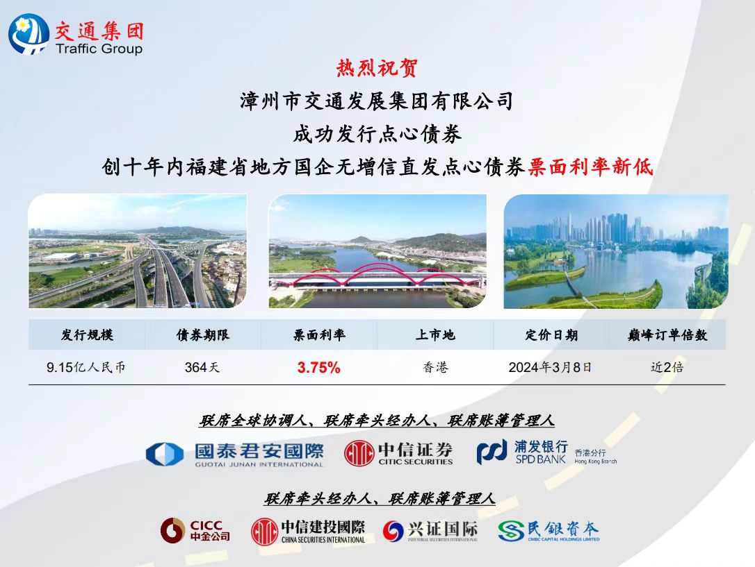 漳州交通集團(tuán)積極響應(yīng)國(guó)家省市政策號(hào)召,不斷健全融資風(fēng)險(xiǎn)防控機(jī)制,拓寬融資渠道,完善融資模式,持續(xù)穩(wěn)健探索國(guó)內(nèi)國(guó)際資本市場(chǎng)。本次境外債券項(xiàng)目自啟動(dòng)以來(lái),在集團(tuán)與全球協(xié)調(diào)人國(guó)泰君安國(guó)際、中信里昂證券的共同努力下,各方高效聯(lián)動(dòng),迅速落實(shí)發(fā)行前的各項(xiàng)準(zhǔn)備工作,通過(guò)對(duì)當(dāng)前市場(chǎng)的合理研判,精準(zhǔn)把握了市場(chǎng)窗口。同時(shí),項(xiàng)目團(tuán)隊(duì)積極推動(dòng)銷售工作,夯實(shí)投資訂單,最終獲得了境內(nèi)外超過(guò)25位知名市場(chǎng)投資人的大力支持,本次點(diǎn)心債券發(fā)行工作圓滿完成。