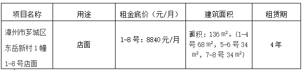 漳州市東岳新村1幢1-8號(hào)店面承租人?,F(xiàn)將具體事項(xiàng)公告如下:一、租賃標(biāo)的物(標(biāo)的物以現(xiàn)狀為準(zhǔn)):