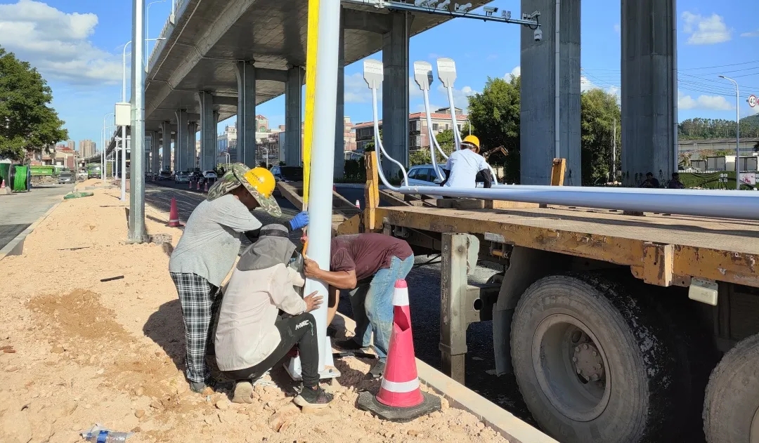 在國(guó)省干線公路聯(lián)十五線東山生態(tài)環(huán)島公路八尺門至光伏產(chǎn)業(yè)園段道路工程施工現(xiàn)場(chǎng),一線建設(shè)者們身著被汗水浸透的工服,堅(jiān)守崗位,忙施工、趕進(jìn)度,現(xiàn)場(chǎng)一派繁忙景象。