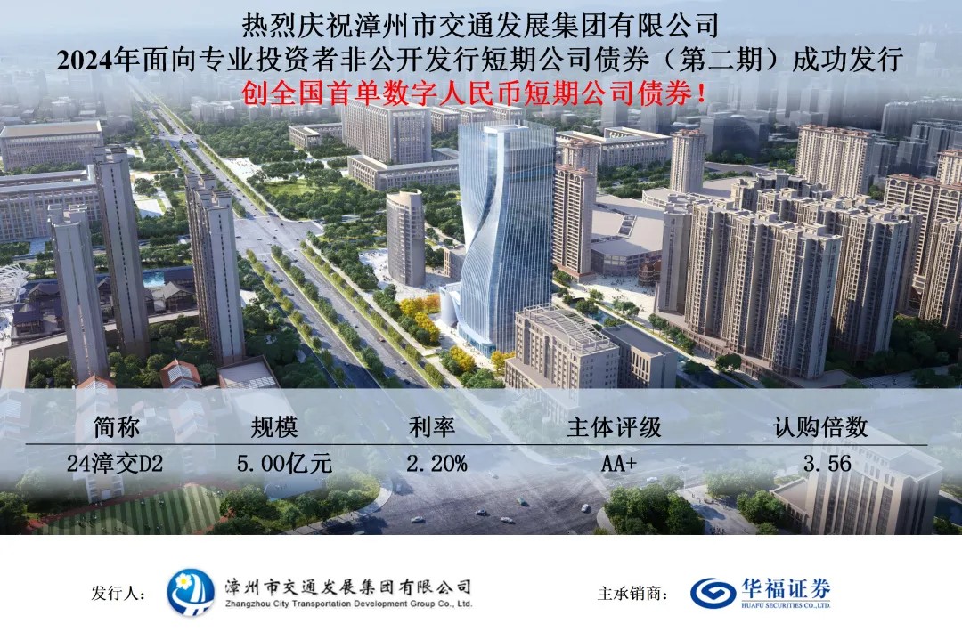 8月29日,漳州市交通發(fā)展集團有限公司成功發(fā)行漳州市交通發(fā)展集團有限公司2024年面向專業(yè)投資者非公開發(fā)行短期公司債券(第二期)。本期債券為全國首單數字人民幣短期公司債券,發(fā)行規(guī)模為5億元,債券期限為1年,主體評級為AA+,由華福證券擔任獨家主承銷商,發(fā)行利率為2.20%,全場認購倍數達3.56倍。