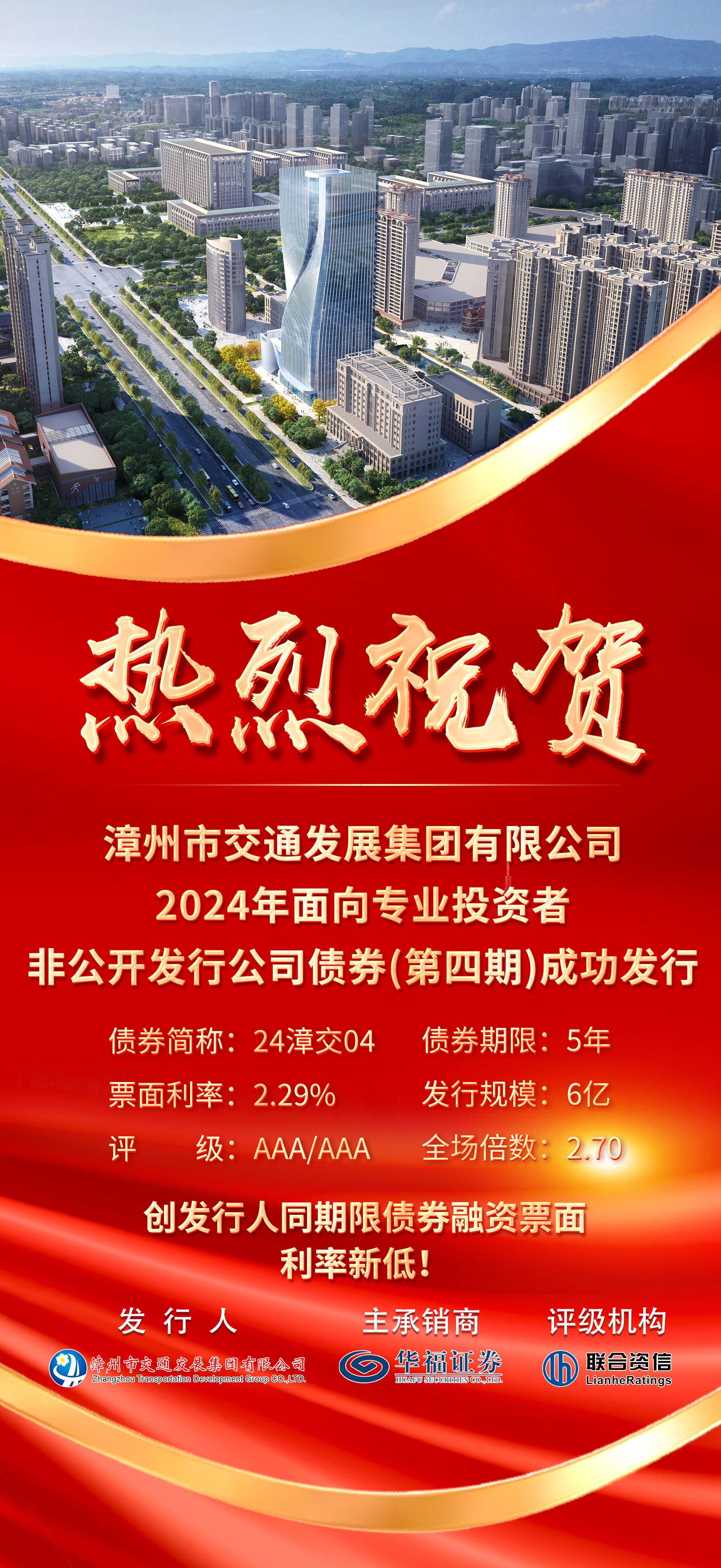 本期債券為漳州交通集團(tuán)獲評AAA主體信用評級后的首次發(fā)行,由華福證券作為獨(dú)家主承銷商,期限5年,發(fā)行規(guī)模6億元,發(fā)行利率為2.29%,全場倍數(shù)高達(dá)2.70倍,創(chuàng)下漳州交通集團(tuán)同期限債券融資票面利率新低。