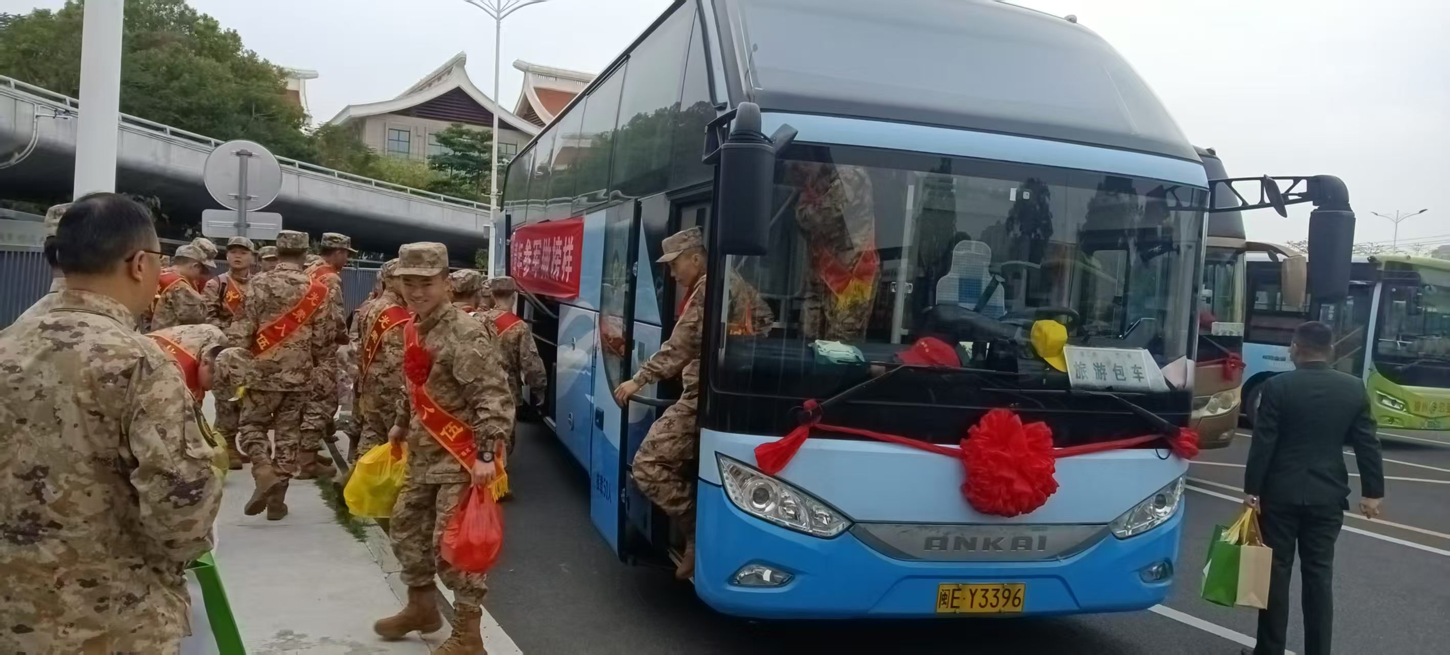 ????旅游車和公交車身上鮮艷的紅花格外引人注目,象征著對每一位新兵的祝福與崇高敬意。車外的標(biāo)語更是激勵著這些年輕的心靈,讓他們在即將開啟新征程途中倍感振奮?! ?/P>