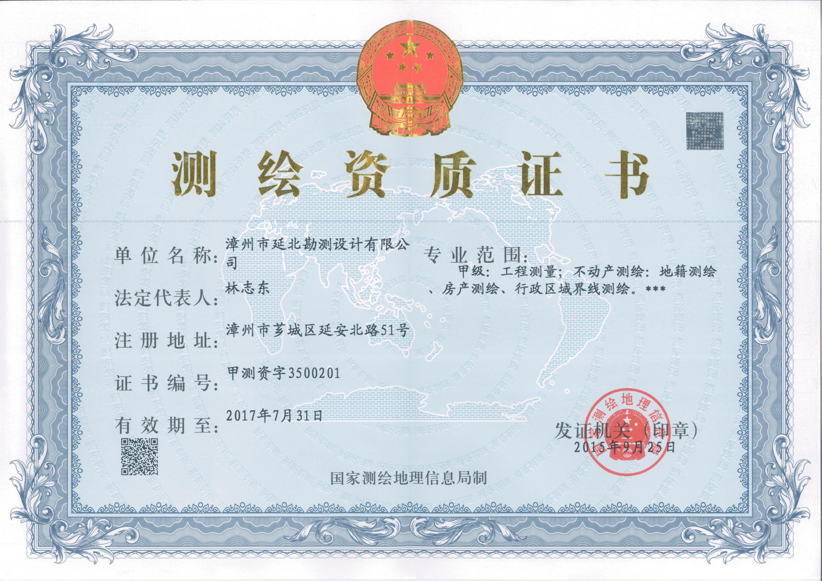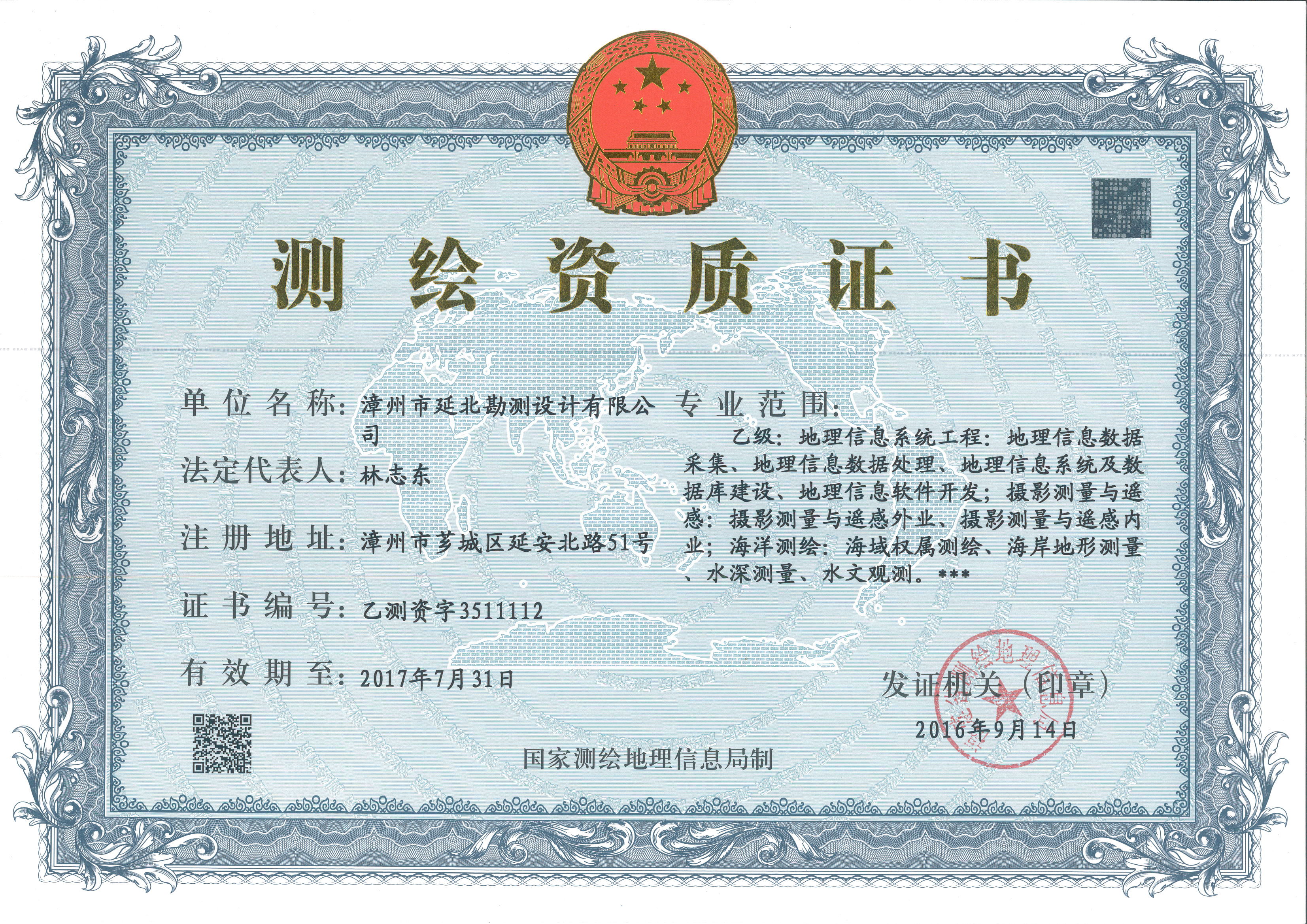 漳州通正勘測設(shè)計院有限公司為目前漳州唯一一家測繪甲級的國有企業(yè),在同行業(yè)中具備較強的竟?fàn)幜Α?/SPAN>為進(jìn)一步拓展測繪業(yè)務(wù)范圍,不斷增強測繪綜合實力,通正設(shè)計院在去年測繪資質(zhì)升級為甲級資質(zhì)(工程測量、地籍測繪、房產(chǎn)測繪)的基礎(chǔ)上,積極努力地進(jìn)行測繪資質(zhì)增項申報工作。經(jīng)福建省測繪地理信息局的嚴(yán)格審查,2016年9月,正式通對了通正設(shè)計院測繪資質(zhì)增項申請,批準(zhǔn)了“攝影測量與遙感、海洋測繪”兩個增項為乙級資質(zhì)。